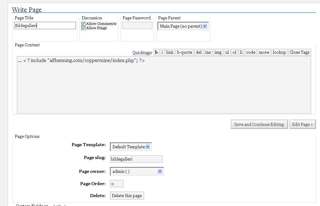 Garreth Skrevet 21. november 2005 Skrevet 21. november 2005 Hmm, hva om du lager en egen template (ser du har et valg der) Så kopierer du den vanlige templaten, og legger til <? include "alfhenning.com/coppermine/index.php"; ?> under eller over koden som skriver ut artikkelen. Så velger du den nye templaten i wordpress til bildegalleri siden. (er ikke sikker om det er så enkelt siden jeg aldri har vært borti wordpress selv, men det er verdt et forsøk)