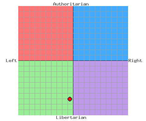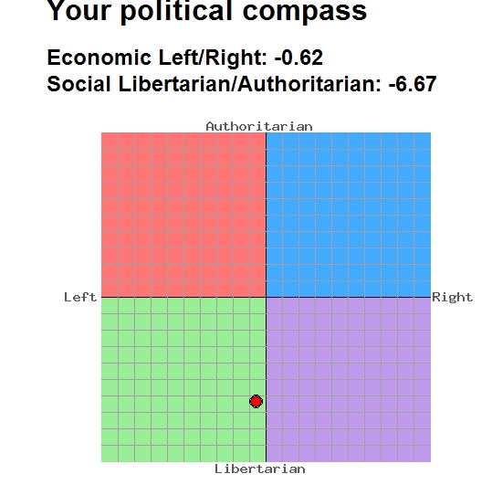 Dotten Skrevet 26. desember 2007 Skrevet 26. desember 2007 Economic Left/Right: 3.25Social Libertarian/Authoritarian: -4.82 <{POST_SNAPBACK}> Economic Left/Right: 1.63 Social Libertarian/Authoritarian: -4.41 <{POST_SNAPBACK}> Og nå endte jeg på: Economic Left/Right: -0.12 Social Libertarian/Authoritarian: -5.49 Gikk ned og inn Jøssda, nå tok jeg et kraftigere byks nedover. Vet ikke helt hva som gjorde det, føler ikke at jeg svarte noe annerledes enn forrige gang. Economic Left/Right: -0.62 Social Libertarian/Authoritarian: -6.67 Feltherre: Du må nok et stykke opp for å komme inn i den "sosialistiske" sonen. Dette er vel en amerikansk test og venstresiden i USA kan vel plasseres på høyresiden her til lands. Demokratene anser jeg som plantet til høyre for AP.