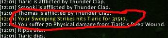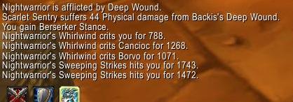 Sett en Mortal Strike for 29xx med Bonereaver's Edge med Enrage og Battle Shout (Var iallefall det han sa) i AB (etter weapon speed nerfen). Den samme warrioren gjorde en 2.2k crit med Blood Thirst også, men det var med noen flere buffs (zerking etc).