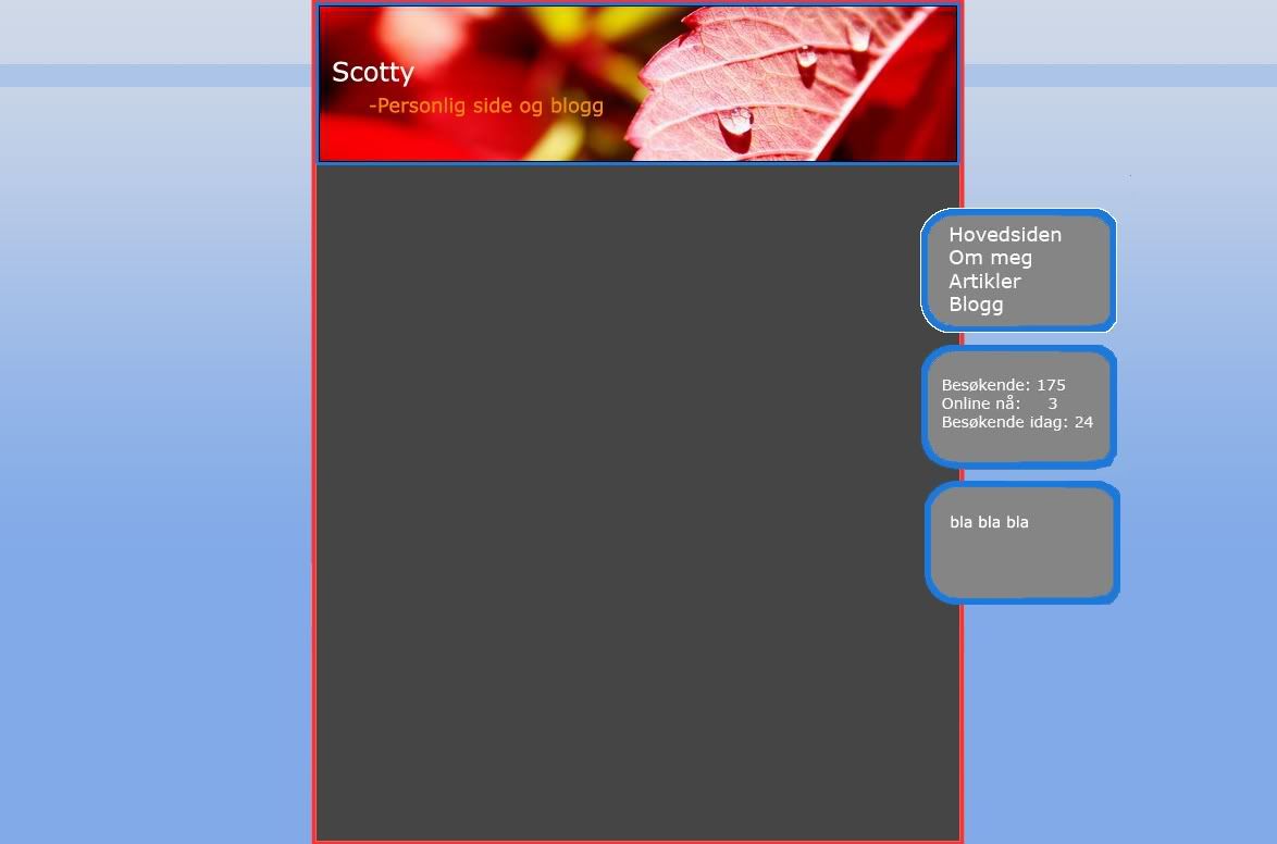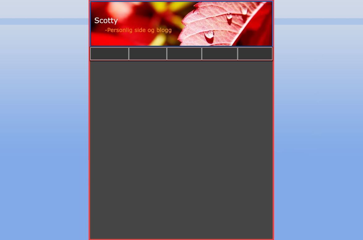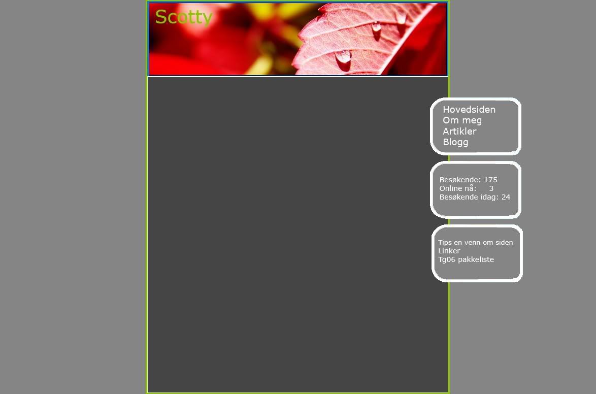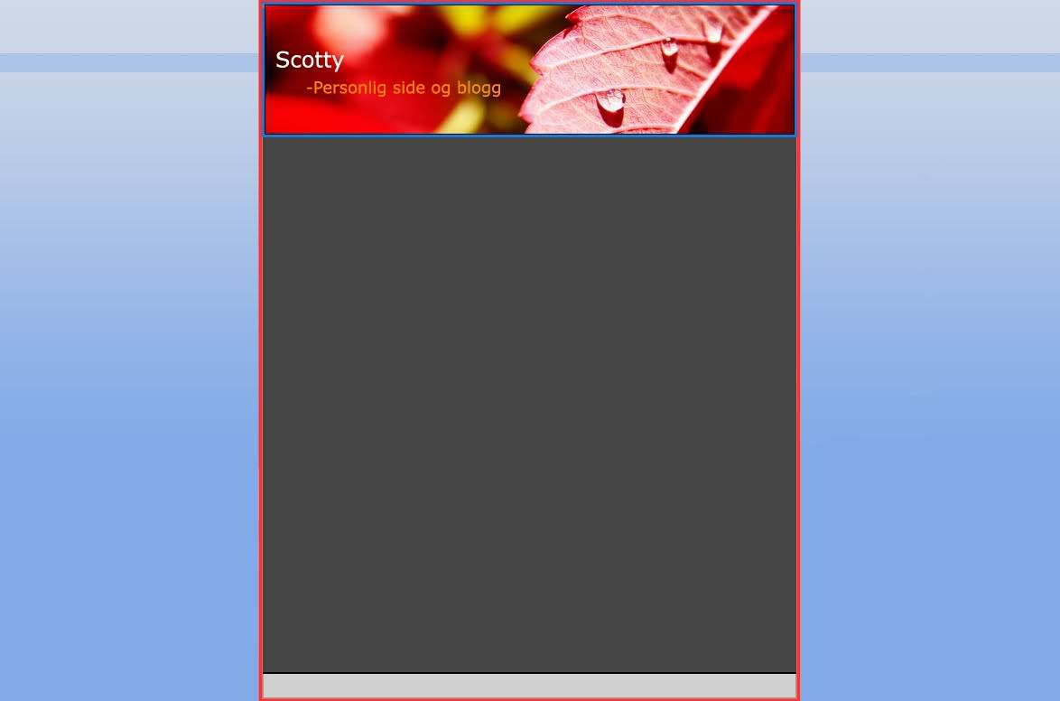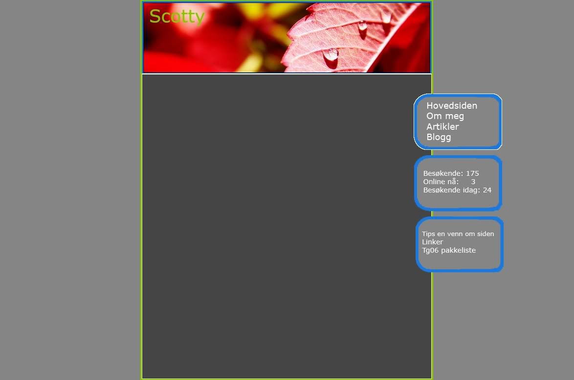 Scotty Skrevet 20. januar 2006 Forfatter Skrevet 20. januar 2006 (endret) Unnskyld at jeg sier det, men jeg synes den menyen så helt forferdlig ut, beklager...Kornete blå border med en hvit utenpå igjen? Og personlig er jeg ikke fan av "Besøkene" og "Online nå" osv... Hva med den enkel meny under header? Og kanskje en footer hadde gjort seg? EDIT: Sjekk innlegget mitt over, der har du en veldig bra farge mikser som gir deg farger som passer sammen! 5467014[/snapback] Det gjør ikke noe Som sagt før så skulle jeg lage nye meny bokser, og det med "besøkende" osv, det er bare noe jeg har skrevet der for å fylle boksene med noe. Er ikke nødvendigvis det som kommer til å stå senere Kan prøve på noen forslag til menyer. Noen som har noen forslag, som vil passe til dette? Kan prøve meg fram, men tar gjerne imot tips. Scotty Endret 20. januar 2006 av .Scotty.
