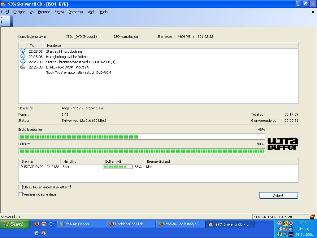 XanderX Skrevet 23. januar 2006 Skrevet 23. januar 2006 (endret) Når jeg skal brenne en fil på 4,4 gb på 8x så skal det ta ca 8min,mn det gjør den ikke den bruker 14min, buffernivå hopper ifra 100 og ned til 20%. Dette skjedde etter at jeg instalerte et nytt hk. ECS Extreme KN1 SLI. Kan noen hjelpe meg Endret 23. januar 2006 av XanderX