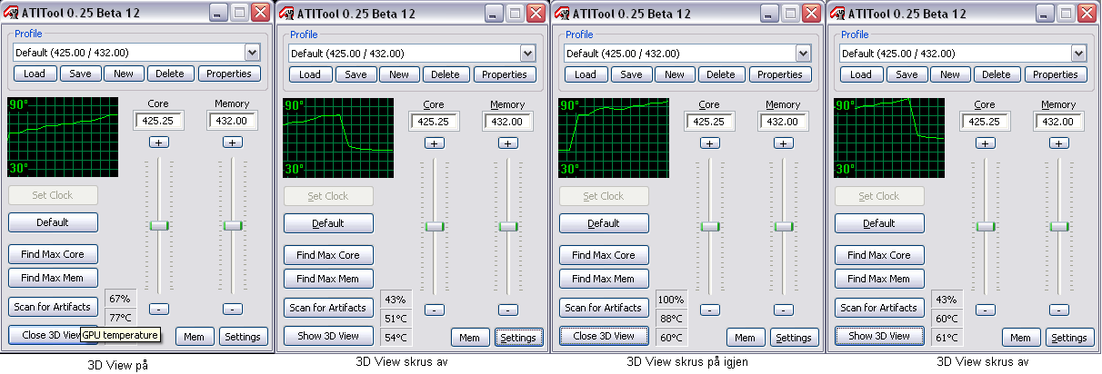 5628452 Skrevet 24. januar 2006 Skrevet 24. januar 2006 (endret) Hei. Jeg har nettopp kjøpt meg et Radeon X700Pro som jeg plukket av og byttet kjøler på. Kjøleren er en diger sak med kjøleribber uten vifter. Vel, GPU-temperaturen var på rundt 35 etter oppstart, men så snart jeg kjørte 3D-applikasjonen i Ati Tools, begynte temperaturen å stige drastisk. Den nådde 77 grader før jeg skrudde av 3DView, og falt ned til 50 grader. Jeg skrudde på 3DView, og temperaturen steg til 91 grader før jeg skrudde av igjen. Nå ligger den på 60 grader konstant. Se på vedlegget for grafer. Så spørsmålene: Er dette en vanlig temperatur? Er det farlig å la den komme høyere? Skal jeg sjekke kontaktflater og kjølepasta? Edit: Jeg leste denne, og tenkte en temperatur på rundt 90 grader gikk greit. Jeg spilte et spill, men temperaturen kom oppe i 107 grader. Forsiktig tok jeg på overflaten av kjøleribbene, og de var temmelig varme. Jeg vil tippe rundt 60-70 grader. Kan jeg sette på en vifte, eller leder ikke ribbene varmen bra nok vekk fra GPU uansett? Endret 25. januar 2006 av Tykjepelken