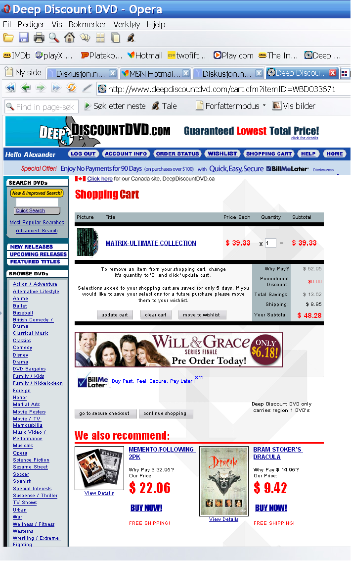Njål Skrevet 10. juni 2006 Skrevet 10. juni 2006 De 20% off kupongene til DeepDiscountDVD, hvordan bruker man dem, Zaeira og Manx skrev opp en rekke ord, jeg gikk in på blant annet DVDtalk.com der fant jeg en link til DDD, når jeg trøkka på den kom jeg bare tilbake til forsiden til DDD. Så hvordan får man denne 'kupongen' til å funke? er mitt spørsmål. 6281434[/snapback] Først, det lønner seg å være logget inn først, det hender at kupongen "glipper" om man legger den inn før man er logget inn. Når du har lagt vare® i handlekurven skriver/kopierer+limer du inn en av kupongene i feltet merket "Enter Promotion/Sale Code: " og trykker på knappen "submit code"rett over knappene "go to secure checkout" og "continue shopping". På neste side er de 20%-ene trukket fra. Husk at kupongene ikke gjelder på forhåndsbestillinger (men forhåndsbestillinger på forskjellige datoer et stykke fram i tid er en bra måte å minske fraktutgifter per dvd på).