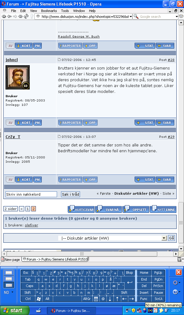johncl Skrevet 3. februar 2006 Skrevet 3. februar 2006 Er enig med deg Knut at varmen er et problem når man skal sitte og holde den i sofaen. Er nok et godt argument for å holde seg unna der. I tillegg har du nok rett at 600 pixels bredde når man holder den i høydeformat er for lite til en typisk webside også. Ingenting irriterer mer enn å måtte scrolle horisontalt. Så eneste fordel jeg kan se er å ha den som en assistent til en fotograf som er på farten. Kjekt at den har integrert CF port, noe mange av disse bærbare ser ut til å glemme totalt i disse dager på tross av at mange digitale speilrefleks kamera bruker CF. Men til 16000 kr blir det et litt dyrt leketøy i så måte. En Epson P-2000 til godt under halve prisen vil nok fungere fint til dette og være enda lettere og mindre å bære med seg i fotobagen. Finnes det noen gode og lette tablet pc'er som kan egne seg til det bruket jeg ser for meg? Altså en slags sofa-surfe-lese-pc og foto-storage når man er på tur? Jeg er fremdeles på jakt etter noe slikt.