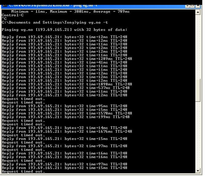 gunnberg Skrevet 4. februar 2006 Skrevet 4. februar 2006 Hei, Vil først bare si at de enkleste løsninger er prøvd da jeg har medium peiling på nettverk. Har nett fra NGT gjennom en netopia router. Har satt opp en Topcom trådløs router bak denne som en gateway (DHCP slått av, trådløs+2 maskiner satt opp med fast ip). WEP kryptering, 11g only mode, TXrate satt til 54Mbps (burde denne stå på auto eller lavere?), Super G with Dynamic Turbo). Mellomspørsmål: Burde/har det noe å si om jeg disabler NAT funksjonen i trådløs routeren? Ingen andre maskiner har vært inne på nettverket, dette er sjekket. Nettverket fungerer meget bra når vi f.eks overfører filer internt. Da viser netstumbler stabilt nett og hastigheten ligger på ca 8-15Mbps. Det kjøres på kanal 6 (kan ikke endres uansett) som er den minst belastede kanalen i nabolaget, og ingen signaler av betydelige styrke som forstyrrer. Problemene oppstår når nettverket belastes inn gjennom netopia routeren. Har vært inne i netopia og sjekket og den påstår den mottar 5888 kbps. Målingene mine på dinside og itavisen over trådløsnettet viser fra 90-300kbps. Det er ikke ønskelig å måtte koble rett på routeren for å teste, da det ikke er helt enkelt å flytte på noen av maskinene her. Jeg legger ved skjermbilde fra netstumbler når nettet belastes utenfra + skjermbilde der jeg pinger vg.no. På en slik ping får jeg maksping på over 4k og snitt på alt fra 300-800 som er heeeelt uakseptabelt. Wireless Zero er deaktivert. Noen gode forslag?