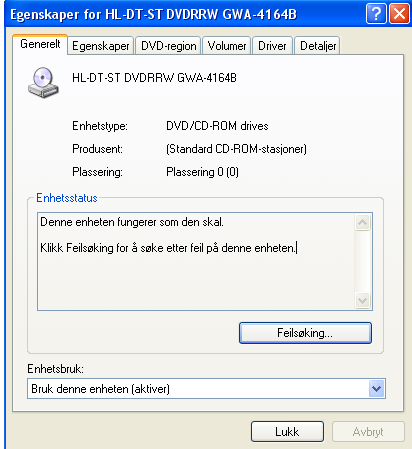 GANTEN Skrevet 10. mars 2006 Forfatter Skrevet 10. mars 2006 Ok, da tar vi det fra bunnen av. Høyreklikk på Min Datamaskin, velg Egenskaper, så velger du Maskinvare og klikker på Enhetsbehandling. Her inne klikker du på DVD/CD-ROM-stasjoner, se hva som står der. 5734169[/snapback] se vedlegg generelt.bmp