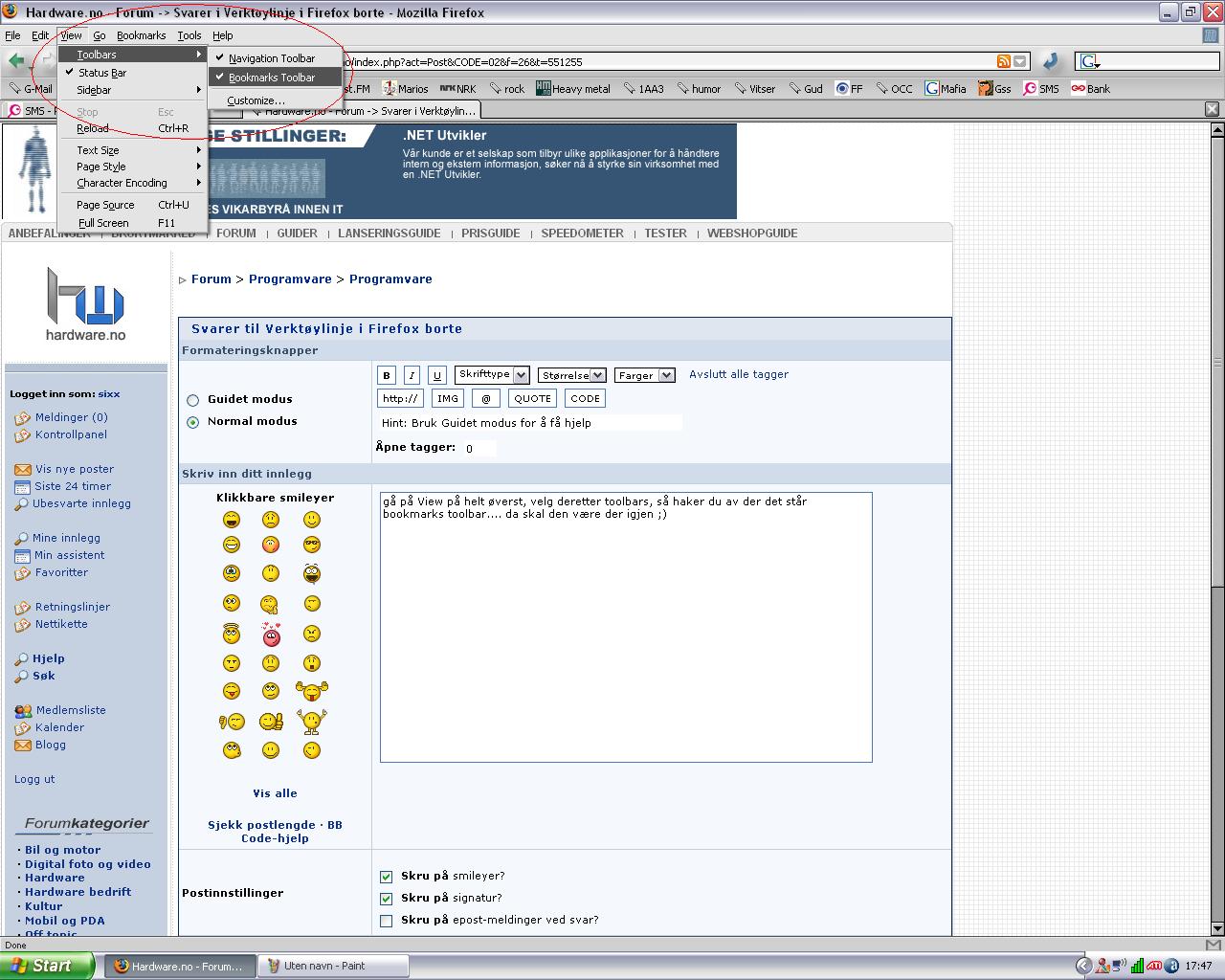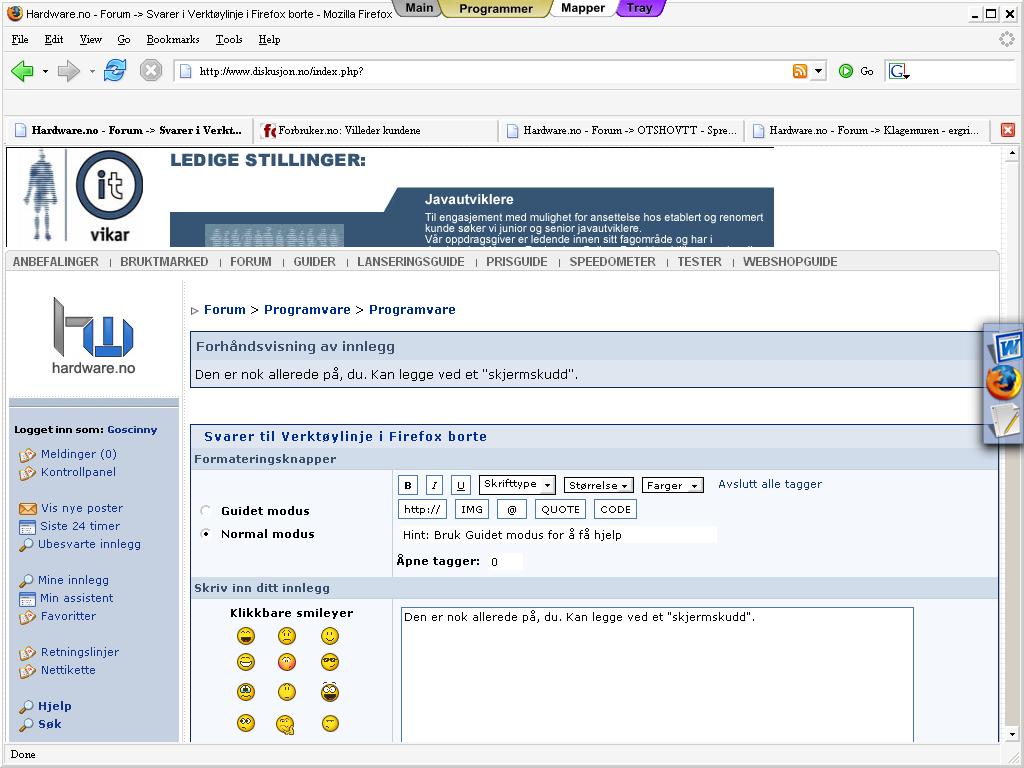 Goscinny Skrevet 15. mars 2006 Skrevet 15. mars 2006 Hei! Jeg skulle nylig rydde litt i diverse knapper i FF. Da jeg var ferdig, oppdaget jeg til min store forundrelse at den linja hvor man legger sine mest brukte favoritter var borte! Du veit... En slags quicklunch-bar. Kan jo sette FF tilbake til deafult, men det burde ikke være nødvendig.