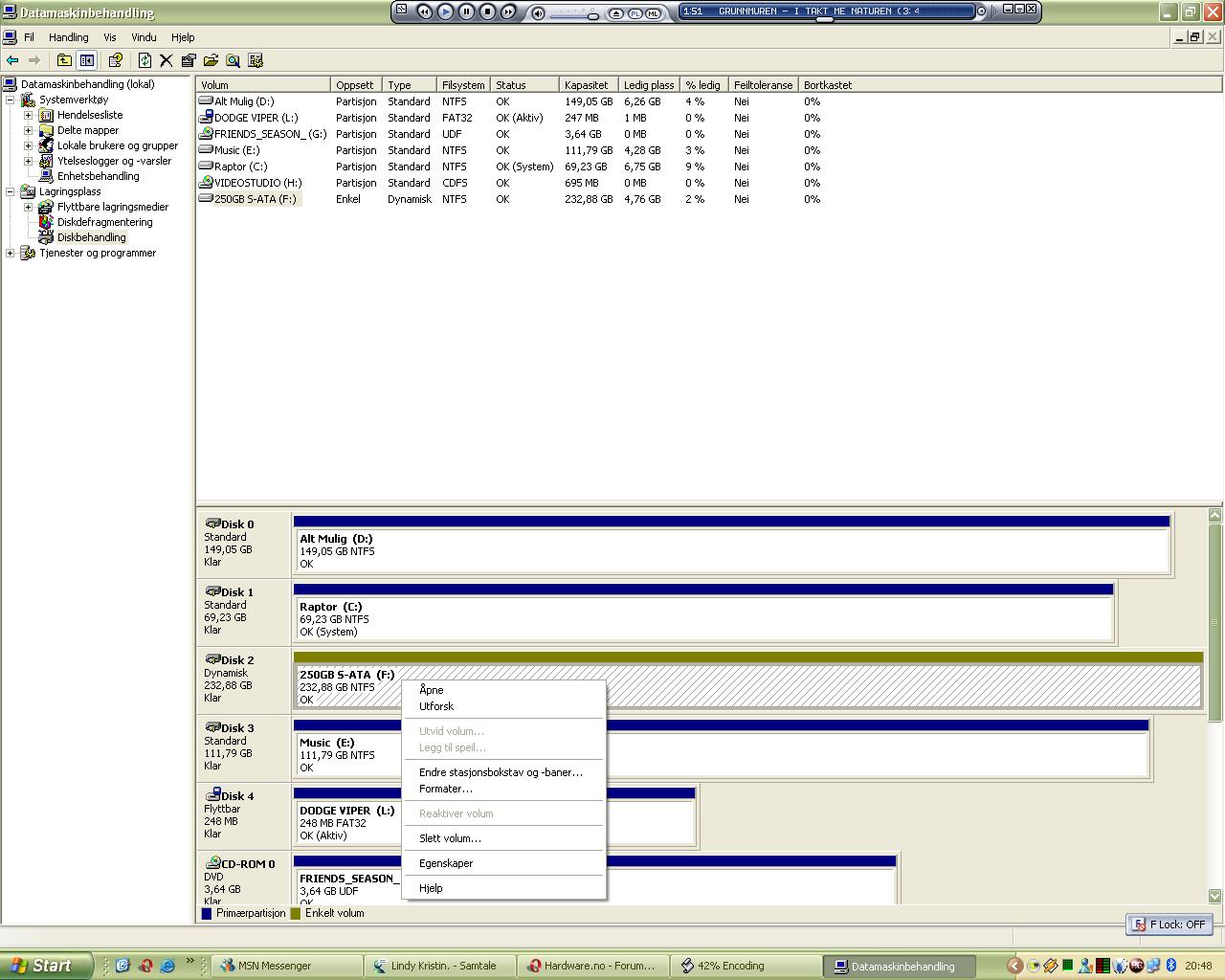 Solefald Skrevet 24. mars 2006 Skrevet 24. mars 2006 høgre klikk på min datamaskin, gå på behandle..så diskbehandling=) finn disken der, og så ser du kanskje kva du kan gjere
