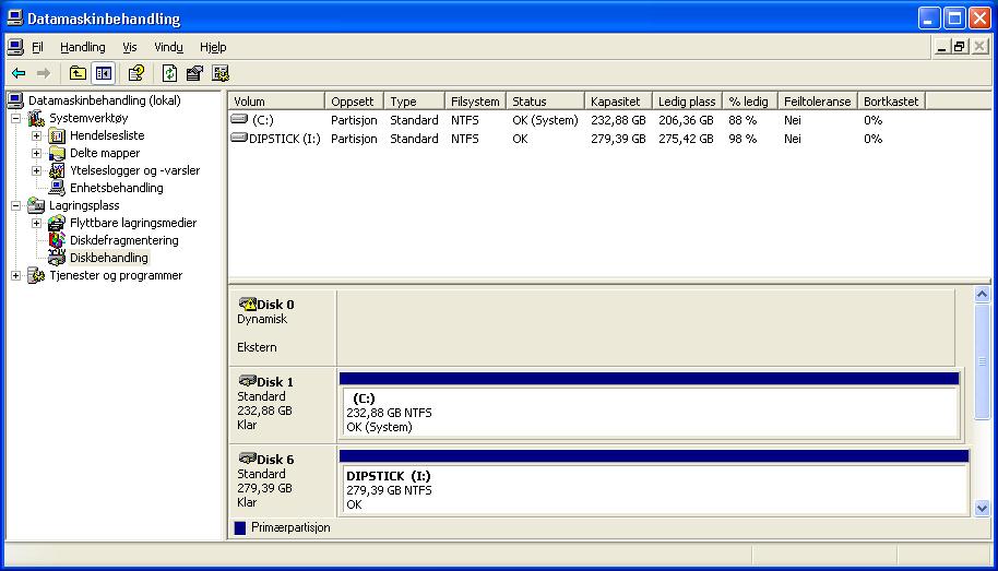Giro Skrevet 24. mars 2006 Forfatter Skrevet 24. mars 2006 Hei igjen Maxtor disken har det aldri vært noe windows på. Dipstick er helt riktig en usb disk maxtor one touch. Skjønner heller ikke hvorfor den dukket opp som"0", da pcen var ferdig bygd(av netshop). pc en ble jo brukt ett par dager før disken ble satt inn. Det sitter en minnekort leser? som tar opp de andre bokstavene , derfor nummer 6 tror jeg. Hvis jeg høyre klikker på disken i disk manager for jeg 3 valg: konverter til standardisk,(og så beskjed om att all data blir mistet), egenskaper og hjelp. i egenskaper står det att denne enheten fungerer som den skal. hmmmm. Skal prøve løsningen din nebrewfoz.