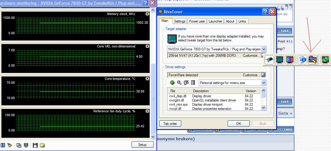 PsychoDevil98 Skrevet 9. april 2006 Skrevet 9. april 2006 Prøv med rivatuner. Der kan du også sjekke tempraturen, og samtidig tweake litt med instillingen. Everest Home Edition er, som nevnt før, også en mulighet