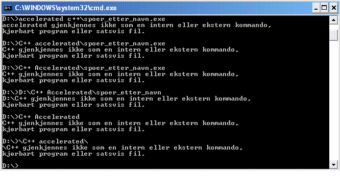Hårek Skrevet 12. april 2006 Skrevet 12. april 2006 Feilen du har gjort er at det er mellomrom i kommandolinja, derfor oppfattes bare det første ordet. Du kan bruke anførselstegn: "C++ Accelerated/spoer_etter_navn"
