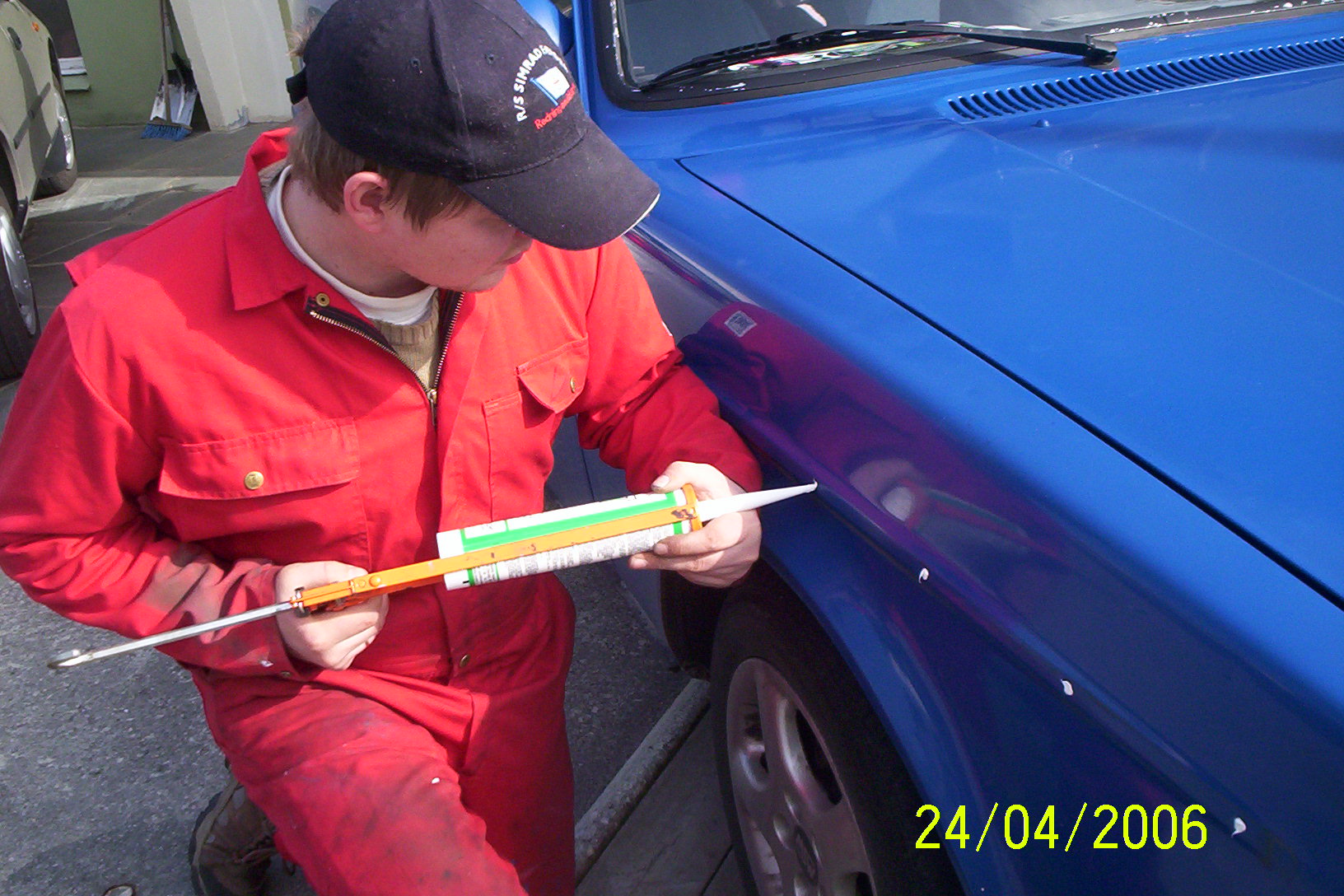 aremme Skrevet 24. april 2006 Forfatter Skrevet 24. april 2006 (endret) Hehe du har en point der Kentsor. men overt til noe anna har begyndt med forskjellige ting her i dag. har fylt listehola med sikaflex og skal sparkle igjen en dag er får tida også skal eg sparkle alle små bulker, begynte såvidt å pusse ned (Dama som begynte på det) fekk og vete at det ikkje er benga lakk som er på bilen BARE DÅRLIG FOR ARBEID men men håper det blir bra når en er ferdig. La og opp ny og kjukare kabel fra dynamo til batteri. Og ny jording fra dynamo Slenger no ut noen bilder Dama som begynder å pusse Her har eg hatt på sikaflex Her holder eg på og fylle inn i sikaflex Her har dama pussa litt Ny joring fra dynamo Endret 26. april 2006 av aremme
