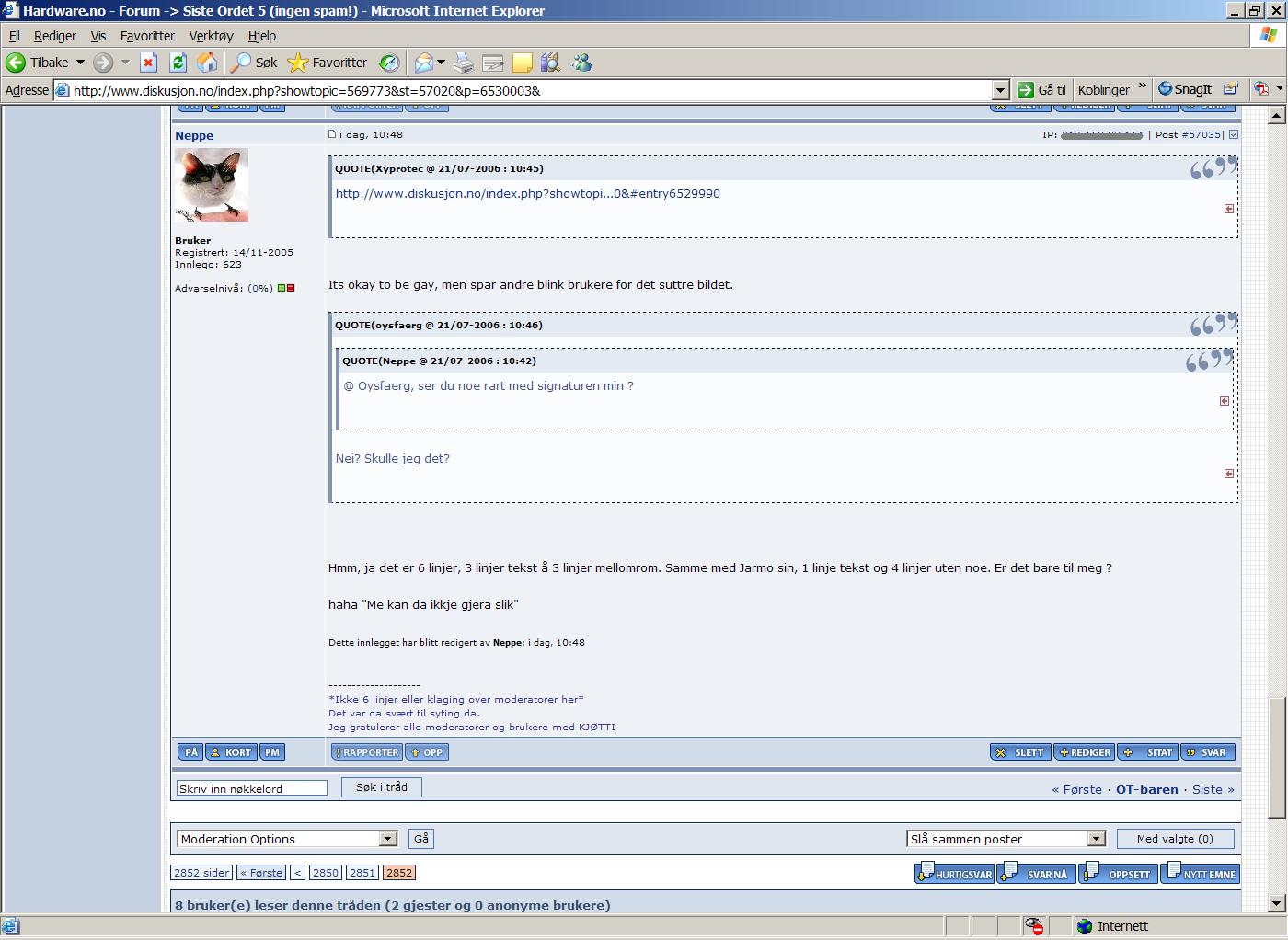 oysfaerg Skrevet 21. juli 2006 Skrevet 21. juli 2006 https://www.diskusjon.no/index.php?showtopi...0entry6529990 6529995[/snapback] Its okay to be gay, men spar andre blink brukere for det suttre bildet. @ Oysfaerg, ser du noe rart med signaturen min ? 6529981[/snapback] Nei? Skulle jeg det? 6529998[/snapback] Hmm, ja det er 6 linjer, 3 linjer tekst å 3 linjer mellomrom. Samme med Jarmo sin, 1 linje tekst og 4 linjer uten noe. Er det bare til meg ? haha "Me kan da ikkje gjera slik" 6530007[/snapback] Ikke no gæærnt med den her, se vedlegg