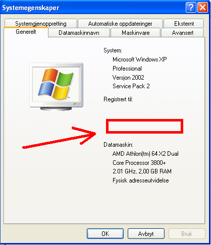 rwu Skrevet 28. april 2006 Skrevet 28. april 2006 (endret) Mista/rota bort selvfølgelig cd-keye til Windows XP. Hadde egentlig tenkt og legge det inn på nytt igjen, men da trenger jeg jo cd-keyen. Har kikka innom "kontrollpanel --> system" og funnet noe som ligner en cd-key der. Bildet ligger som vedlegg. Kan noen bekrefte eller avkrefte om det er dette tallet som er den virkelige cd-keyen? 6003924[/snapback] Nei, dette er produkt IDn din. Vet ikke om det er mulig å finne cd-nøkkelen manuelt. Den er ikke lagret i klartekst i registeret. Vet det var et program kalt 'WindowsXP Product Key Viewer' en gang der du kunne finne cd-nøkkelen på systemet ditt. Vet ikke om det går å få tak i enda, eller om det i det hele tatt er lovlig. Endret 28. april 2006 av rwu