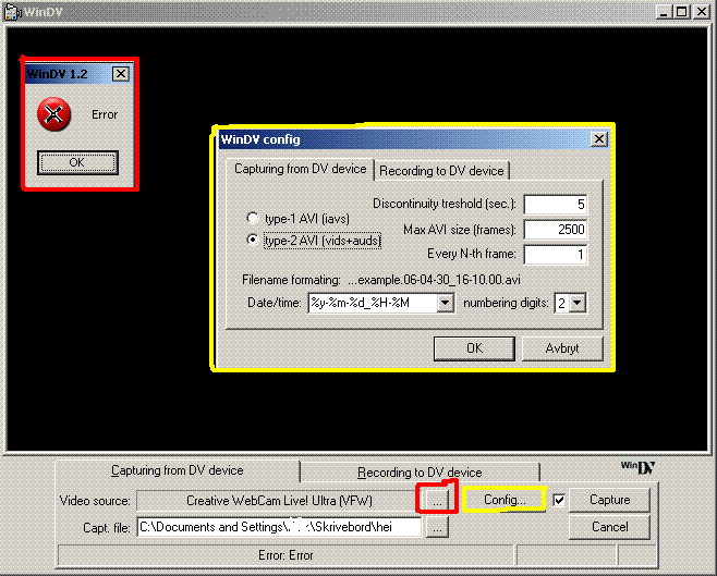 r2d290 Skrevet 30. april 2006 Skrevet 30. april 2006 (endret) Hei. Har lasta ned ett prg som heter winDV. I begynnelsen fungerte det fint, men senere, etter at jeg prøvde å bytte fra videokamera til web, og så tilbake, kom det en error jeg ikke får til å fikse. Er det noe galt med settings? BTW. det er ikke webcam Live jeg vil ha, men DV-videokamera jeg vil ha... Bilde av problemet: Uten_navn.bmp Endret 30. april 2006 av r2d290