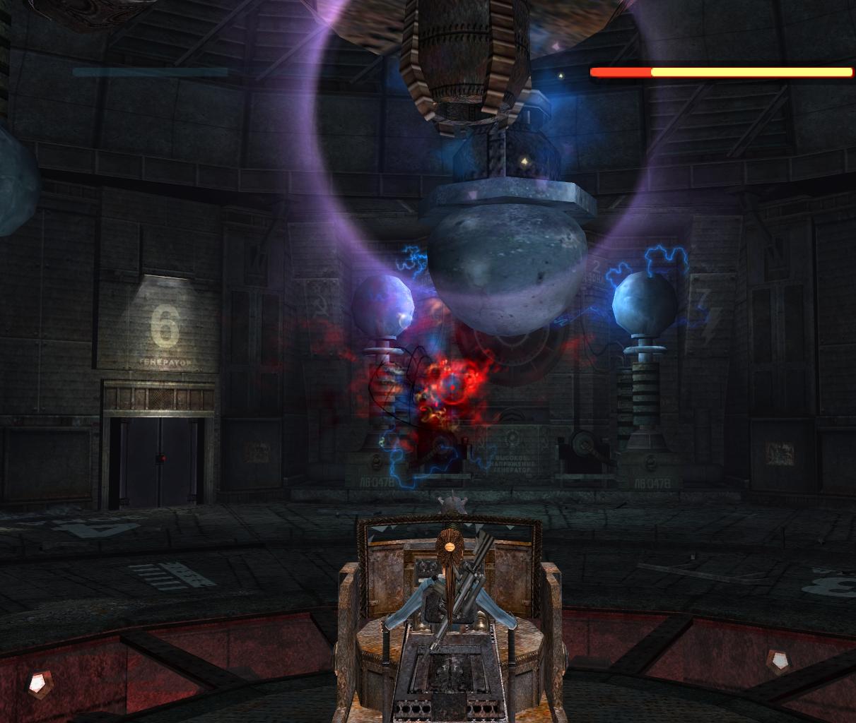 Du skal skyte på det store strømledende kulene i taket helt til de henger seg opp i elektrisiteten mellom det to kulene ved veggen. Etter å ha gjort dette på alle fire kulene må du kjappe deg å dra ut sverdbiten som sitter rett over hodet på deg (når du sitter i "stolen") med den kastewiren du har.