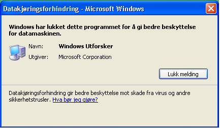 mr_trout Skrevet 9. mai 2006 Skrevet 9. mai 2006 Høyreklikk på min datamaskin, velg egenskaper. Deretter velger du avansert, og klikker på innstillingsknappen under ytelse. Trykk fanen "datakjøringsforhindring". Der slår du på DEP, med unntak for utforsker. Det har fungert utmerket for meg tidligere. Problemet har senere forsvunnet etter reformatering.
