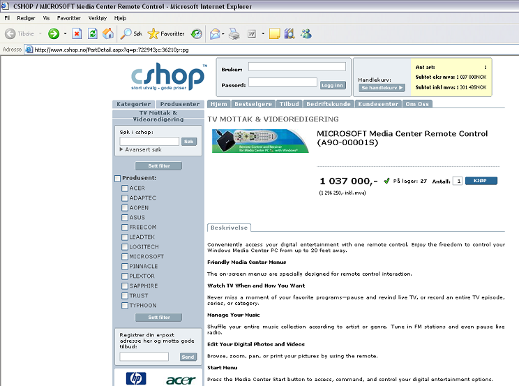 Teater Skrevet 16. mai 2006 Skrevet 16. mai 2006 Dette må være den dyreste fjernkontrollen jeg har sett noen gang. Legger også ved et screenshot i tilfelle de fikser feilen. MICROSOFT Media Center Remote Control 1 037 000,- (1 296 250,- inkl. mva) Dyr.bmp