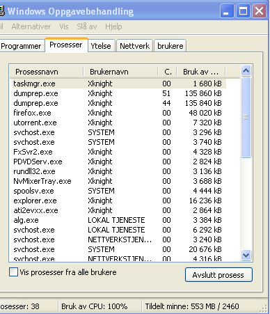 XanderX Skrevet 17. juni 2006 Skrevet 17. juni 2006 (endret) Når jeg starter en film uansett program så starter dumprep.exe, Dette fører til at bruk av cpu: 100% oppgavebehandling.bmp Endret 17. juni 2006 av XanderX