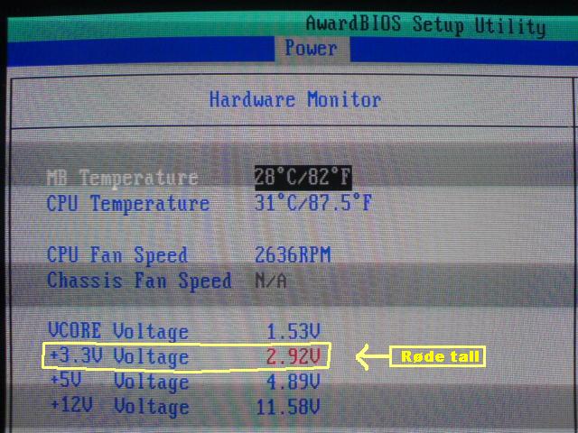 BorN Skrevet 21. juni 2006 Skrevet 21. juni 2006 (endret) Sånn ca Annenhver gang jeg starter PCen under oppstart, kommer det advarsel om at alt ikke er som det skal være med "Power settings" ifølge "Hardware Monitor" i BIOSen: Under lasting av diverse andre ting, kommer det opp melding om at "Hardware Monitor found an error" Jeg trykker del, velger Power, og deretter Hardware Monitor Røde tall er nok feil med ett eller annet, så det er noe feil med +3.3V Voltage. Er kanskje noe klurings med strømforsyninga. Har hatt problemer med strømforsyninga før (PCen slo seg rett av *klikk* av seg selv), og kjøpte ny strømforsyning (En billig Qtec 300W -- 300W for lite?). Ser på en lapp på strømforsyninga i PCen at +3.3V er Orange ledninger. Og det er et sett med ledninger fra PSUen som inneholder orange ledninger, som ikke er plugget i noen plass. De har vært løse lenge, vet ikke hvor den skal inn, har ikke funnet noen passende hull. Men altså, hvordan løse dette problemet? MEGET takknemlig for kloke svar! Endret 5. juli 2006 av BorN
