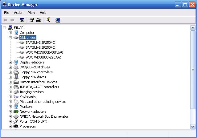 Gjest Slettet+987123 Skrevet 25. juni 2006 Skrevet 25. juni 2006 Heisann! Har akk satt inn en ny Samsung SpinPoint P120S 250GB SATA2, har 1 stk fra før, syns den virkra utrolig bra: ) Men dealen er den at den ikke komme opp på Min Datamaskin.: p Har prøvd å oppdatere drivere osv.. bytta s-ata plass, starta uten disken i, satt den i å starta.. finner den ikke.. annet enn på Device Man.. Har lagt ved et bilde av det som skjer.. Er det noen som vet? Kan hende det bare er en liten fille-ting, men ikke noe jeg kommer på nå: p Har ikke vært inne i BIOS å sjekke, siden PC`n "finner" disken..