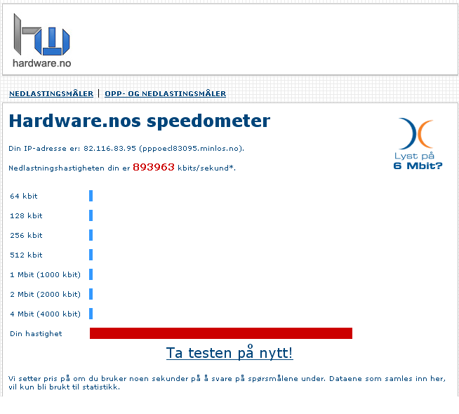 atLind Skrevet 25. juni 2006 Skrevet 25. juni 2006 Fikk en gang 131mbps på Baneteles speedtest på min 700kbps ADSL linje