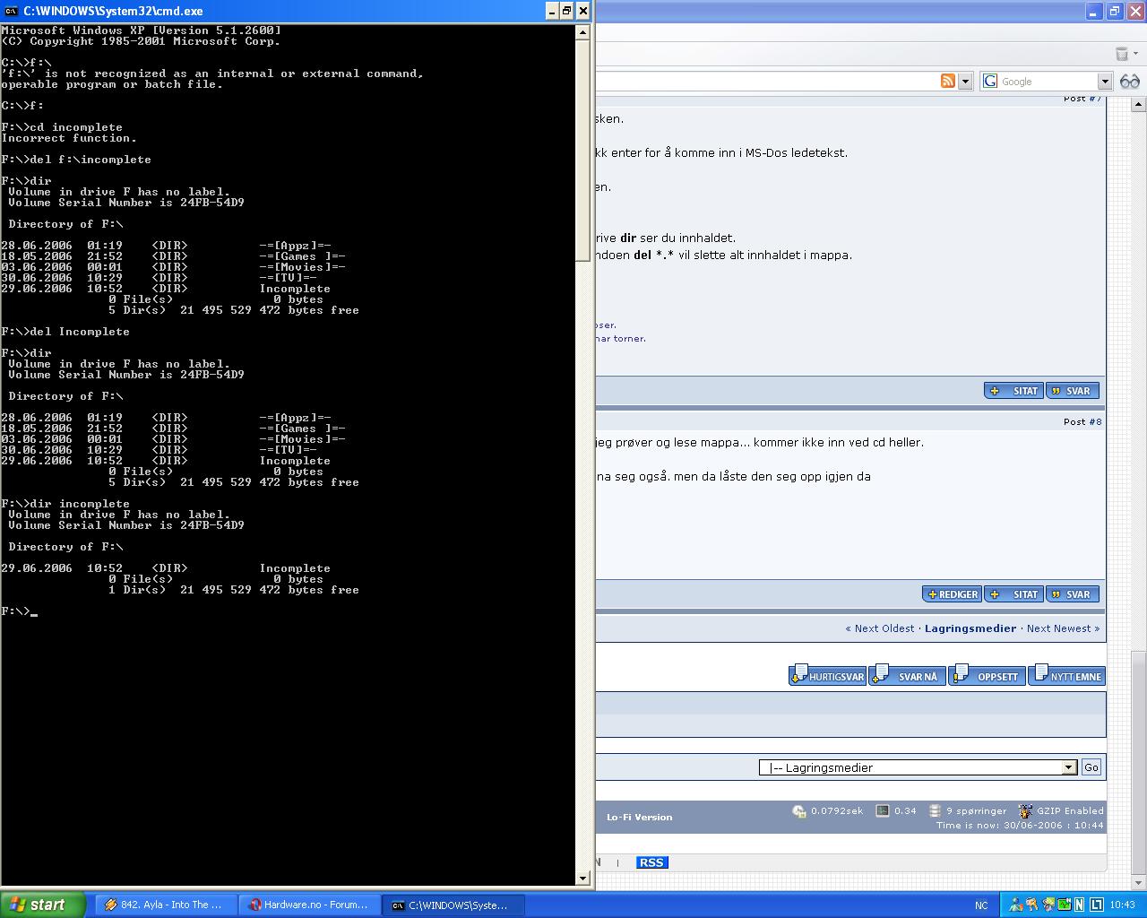 Sweet Skrevet 30. juni 2006 Forfatter Skrevet 30. juni 2006 ved kommandoen får jeg incorrect function når jeg prøver og lese mappa... kommer ikke inn ved cd heller. har prøvd del f:\incomplete, men da hang maskina seg også. men da låste den seg opp igjen da