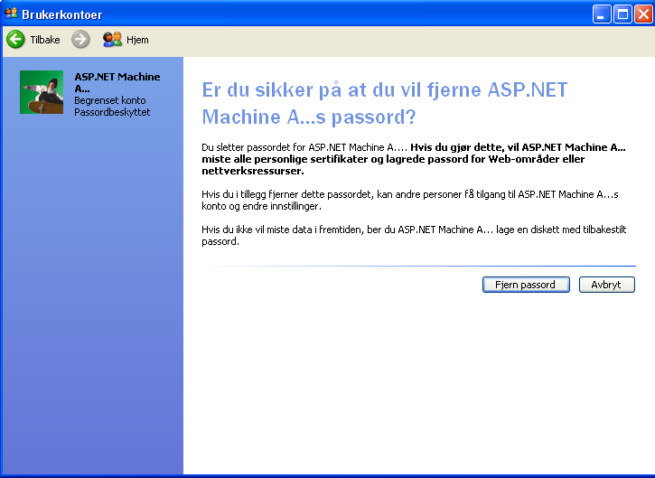 macba Skrevet 25. juli 2006 Forfatter Skrevet 25. juli 2006 Gikk inn på brukerkontoer for å deaktivere gjest. Plutselig så jeg en annen brukerkonto! Den het ASP.NET Machine A... !! også er den passord beskyttet! gggggg.bmp Å viss jeg prøver å endre passordet eller fjerne det står det: xxxxxxxxxxxx.bmp Vil vite hva som er innpå den.. Hva skal jeg gjøre? Kan det være virus? For noen dager siden lastet jeg ned noe også åpnet jeg det. Så kom det en svart skjerm. Jeg prøvde å skru av men det kom bare flere da. Å først etterpå fant jeg ut at det var virus! 6554884[/snapback] Eller er det ikke noe å være redd for. Jeg søkte litt på google å fant ut at det ikke er farlig. Er det sant?