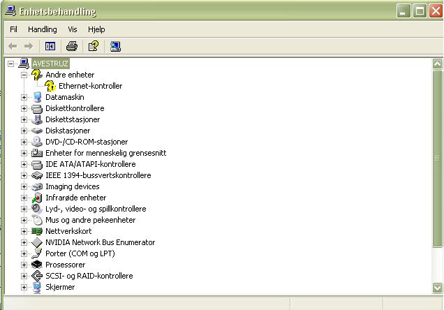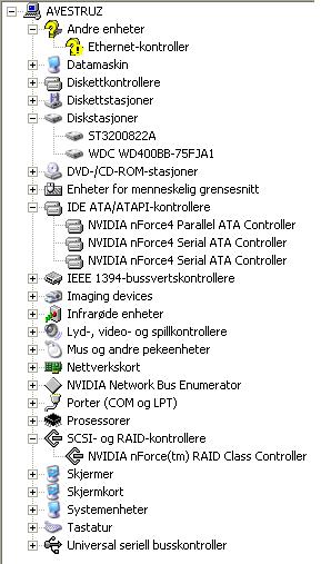 Hårek Skrevet 8. august 2006 Skrevet 8. august 2006 Hvilket hovedkort har du? Det er en device som mangler driver, muligens en nettverkskontroller. Det trenger ikke ha noe med problemet å gjøre. Kan du sjekke hva som finnes under "SCSI- og Raid-kontrollere", "Diskstasjoner", og "IDE ATA/ATAPI-kontollere".