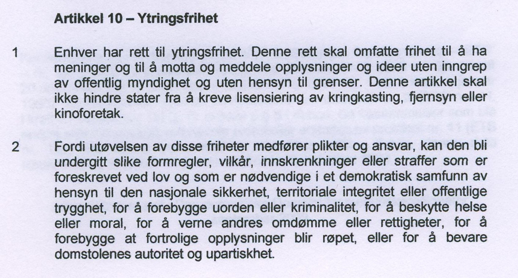 I tillegg gjelder artikkel 10 i menneskerettskonvensjonen: