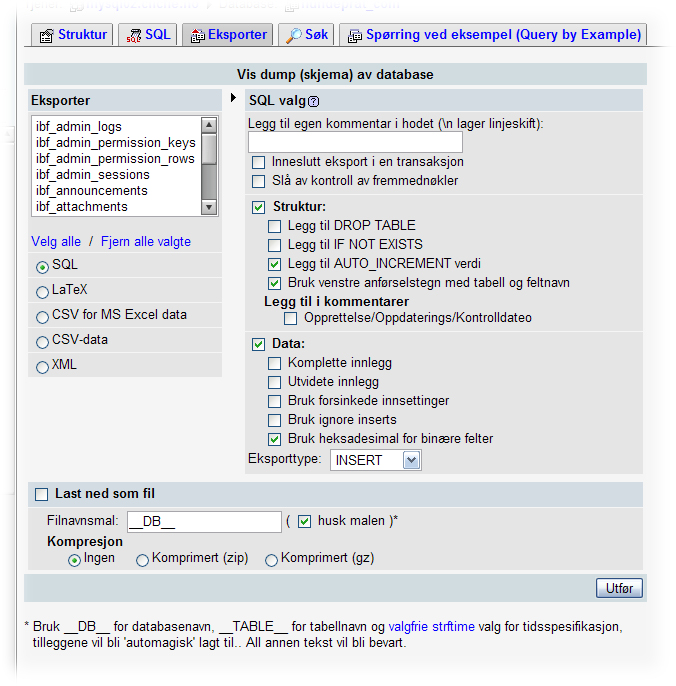 Gjest Slettet+3124 Skrevet 31. august 2006 Skrevet 31. august 2006 Hei. Jeg har ettpar nettsider, og jeg har tenkt å flytte den ene til en ny levreandør? Hvordan gjøre jeg dette? Noen som har en enkel guide? Jeg vil jo overføre hele databasen, så jeg ikke mister innlegg i fra forumet mitt og brukerne? Når jeg går inn på phpMyAdmin er det mange valg. Hvilket er riktig og ta backup av, også eksportere? Hvilke valg skal jeg velge? Når du ser på bildet av databasen? For at dette skal virke må jeg sette opp forumet helt identisk før jeg overfører databasen? Need some help here..