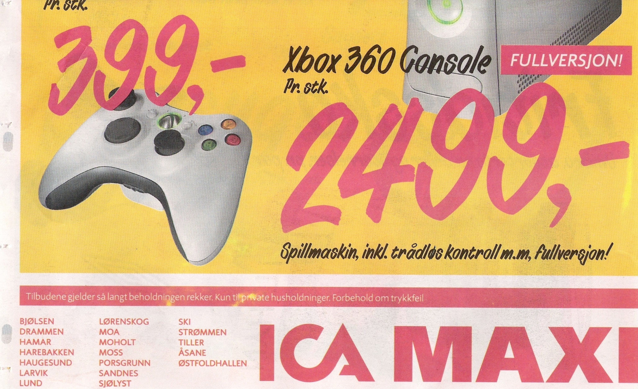 Captain_Nintendo Skrevet 11. september 2006 Skrevet 11. september 2006 Men skal man kjøpe seg en 360 snart, er nok ICA Maxi et lurt sted å kjøpe. Neste fredag selger de Premium for 2499,-6836800[/snapback] Ja, dette er meget fristande, men som sagt så såg ikkje eg heller noko på heimesida til ICA om dette tilbodet. Kan nokon bekrefte at det er mogleg å kjøpe denne på ICA Maxi i Oslo? 6844665[/snapback] Står ikke noen ting om hvilke ICA Maxi butikker det gjelder på reklamen iallefall. Er bare å ringe ned og spørre, står ikke noe om tilbudene kun er forbeholdt noen butikker. Er en del av deres ukeskupp kampanje, nå skal det være ulike kupp hver dag osv.