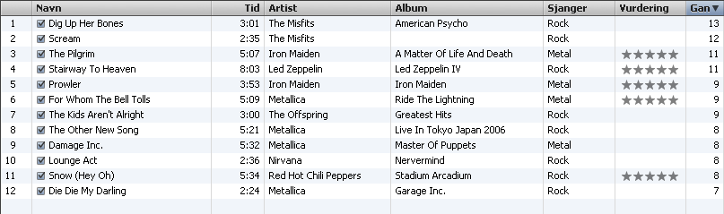 sh- Skrevet 5. desember 2006 Skrevet 5. desember 2006 12 mest spilte. Liker godt de artistene på lista iTunes_mest_spilte.bmp