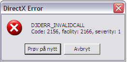 hogst Skrevet 25. oktober 2006 Skrevet 25. oktober 2006 (endret) Får dette erroret når jeg ska åpne "Scarface The world Is Yours" spillet. hva kan jeg gjøre for å få fiksa dt?Uten_navn.bmp DirectX Error D3DERR_INVALIDCALL Code: 2156, facility: 2166, severity: 1 Endret 26. oktober 2006 av hogst