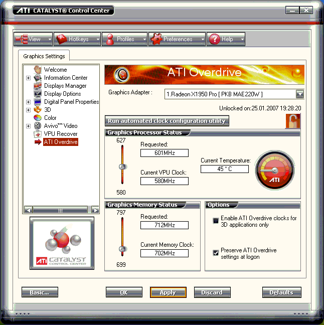tvolsen Skrevet 28. januar 2007 Skrevet 28. januar 2007 (endret) Lurer litt på overklokking med hjelp av Catalyst. Har kjørt automated clock config, og fikk ut tallene 621 og 786. Når jeg stiller inn på disse og trykker på apply står det de nye tallene på requested mens Current er de samme som før. Noe jeg gjør feil ?? 7809588[/snapback] merkelig.... hos meg smeller de inn med en gang.... 575@621 på gpu 685@783på minne. hele 48,9 gb/s i båndbredde (everest) trykker på den hengelåsen for å låse opp deretter justerer jeg frekvensene manuelt( bare justere opp minne og gpu stiller seg da inn på den nærmeste frekv. som passer, haker av bevar klokke ved oppstart. funker fint som fy :-D 7813580[/snapback] Har trykket på hengelåsen, stilt frekvensene, haket av bevare, og trykket apply. Selv etter at jeg har bootet står fortsatt Current clock på orginale innstillinger, mens requested er det jeg stilte til. Hvilken versjon av Catalyst/drivere bruker du ?? Edit: Fjernet de gamle driverene og la inn 6.12 versjonen på nytt og da virket det Catalyst.bmp Endret 28. januar 2007 av tvolsen