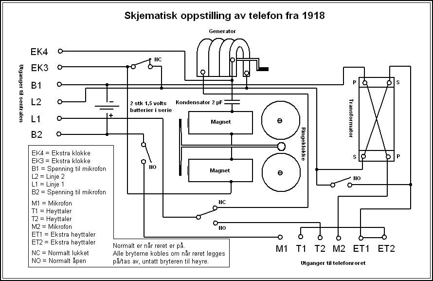 tuusjr Skrevet 24. november 2006 Skrevet 24. november 2006 Heisann! Jeg rotet litt i kjellern forrige helg og da fant jeg en finfin telefon fra 1918 med sveivehåndtak. Så tenkte jeg at jeg skulle få denne til å virke, men det var ikke så lett som å plugge inn i veggen og snakke i vei. Først fikk jeg ikke summetone, men det ordnet seg da jeg loddet på en kondensator og to 1,5 volts-batterier til mikrofonen. Batteriene koblet jeg på for å gi strøm til mikrofonen, da de ledningene som opprinnelig ville gitt strøm til mikrofonen, ikke lenger brukes. Jeg har laget en skjematisk oppstilling av telefonen for å gjøre det lettere å forklare. De to utgangene som brukes til signal er L1 og L2 (se tegningen). Jeg vet at når man tar telefonen av røret, så går det strøm. Da tror sentralen at telefonen brukes, og man får opptattsignal. Det er nemlig slik at når telefonen har røret på, kommer det likestrøm 48 volt. Når det ringer og røret er på, kommer det 96 volt vekselspenning. Når røret er av og man får summetone, ligger spenningen på cirka 1 volt vekselspenning. Dessverre trakk denne telefonen så mye strøm at jeg fikk opptattsignal selv om telefonen bare stod der. Løsningen var å lodde på en kondensator, for den slipper jo ikke gjennom likestrøm. Da fungerte det fint en liten stund, kanskje fem minutter eller noe slikt, men så mistet jeg summetonen på nytt. Så jeg lurer på om det er noen som kan tenke seg hva problemet er eller som har litt kunnskaper rundt dette emnet? Skjematisk_oppstillting_av_telefon_fra_1918.bmp