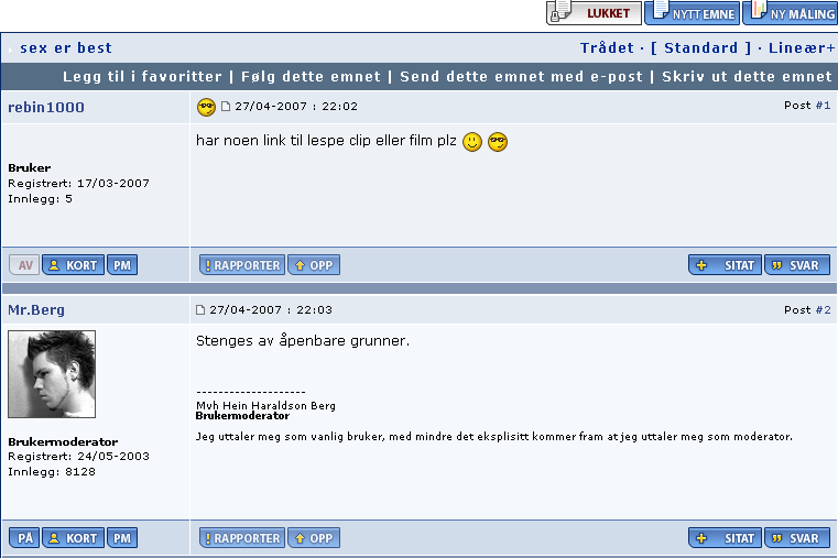 dysfunctional Skrevet 30. april 2007 Skrevet 30. april 2007 (endret) Jeg mente ikke Åsen som et sted, men som en ås. Teiting. Endret 30. april 2007 av VHaakonsen