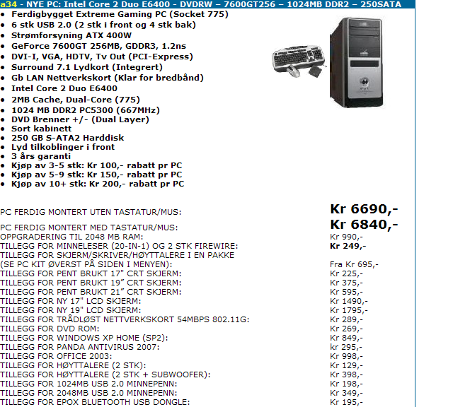 Wishb0ne Skrevet 30. november 2006 Skrevet 30. november 2006 Du får selve pcn i den pakken, men du må bygge den selv.. Eller få hjelp til det av noen du kjenner Det du ikke får er skjerm, mus, tastatur, headset, høytalere Så du får regne litt på hva du vil ha