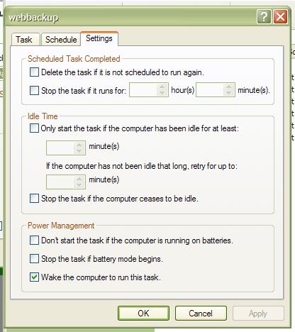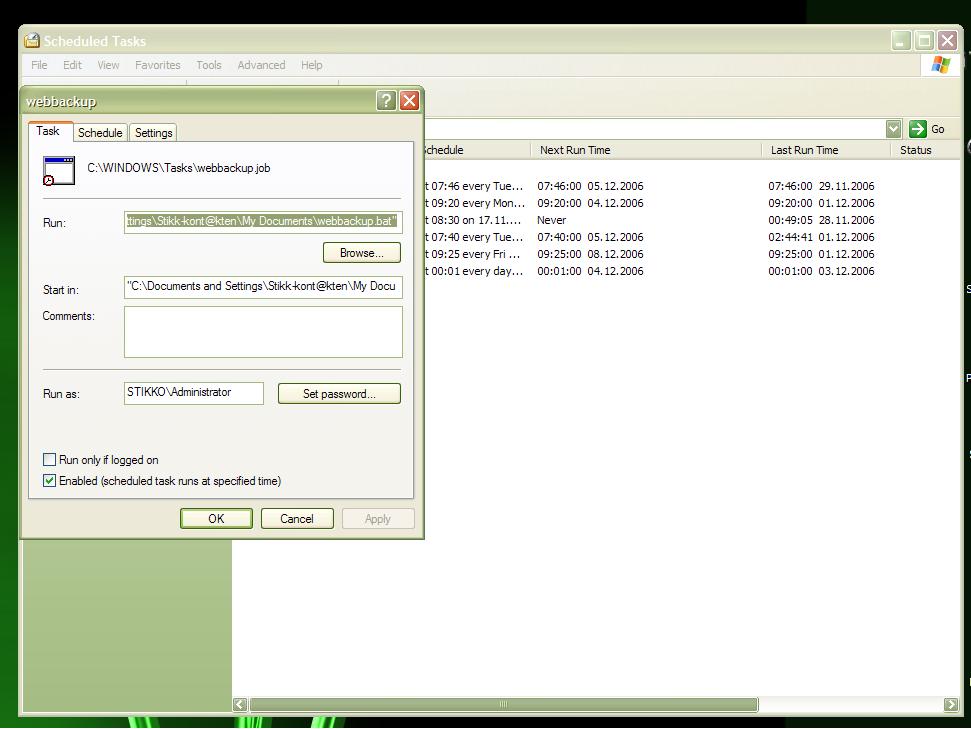 The Stig Skrevet 29. november 2006 Skrevet 29. november 2006 (endret) Hei! Jeg driver for tiden å skrur sammen et enkelt bat script som skal kopiere alt av innehold fra en nettverkstasjon til en lokal disk på min PC. Scriptet i seg selv fungerer fint, men jeg skulle gjerne hatt det til å fungere med "planlagte oppgaver". Planen er altså å kjøre scriptet klokken 3 hver natt, slik at jeg som bruker ikke blir å merke det. Jeg har lagt til scriptet både manuelt og via veiviseren, men ingenting skjer når klokkeslettet inntreffer - Jeg har også prøvd å starte det manuelt med samme resultat. Jeg går utifra at det er en smal sak å fikse dette, men jeg trenger altså litt hjelp. Scriptet ser slik ut: echo off echo Kopierer filer.. echo. echo. XCOPY /e /y Q:\ O:\web-backup Endret 29. november 2006 av Stikk-kont@kten