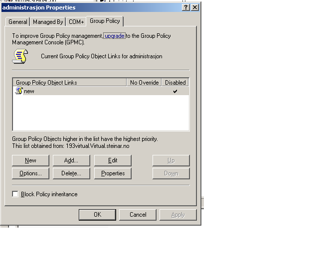 Thulian Skrevet 6. desember 2006 Forfatter Skrevet 6. desember 2006 Hmmm Vel la oss ta Administrasjons gruppa mi som et eksempel da. Den heter, passende nok, administrasjon Om jeg i Active Directory høyreklikker og går inn på Properties der så får jeg opp dette: 4 valg på toppen: General - Members - Member Of - Managed By Under de 4 forskjellige har jeg disse valga: General: Group name (pre windows 2000) : Description : E-Mail : Group Scope er satt til Domain local Group Type er satt til Security Members: Her kan jeg kort og godt legge til og fjerne medlemmer i gruppa Member Of: Her kan jeg kort og godt legge til og fjerne andre grupper denne gruppa skal tilhøre. Managed By: Er om en spesiell bruker skal skrive inn info om gruppa.. tlf, by etc... Så jeg ser ikke plassen du mener.. men om du kan nevne eksakt hvor du mener det kan befinne seg, og da om det er noen annen måte selvfølgelig, på å komme dit så er jeg ekstremt (!) interessert;) Begynner å falle på plass de fleste bitene i oppgaven min, men dette logon scriptet volder meg en del hodebry siden at de delte mappene blir jo ikke helt korrekt heller når det ikke er et logon script som virker...vel mappene virker men de blir ikke displayed på den måten de forhåpentligvis vil bli når alt funker..