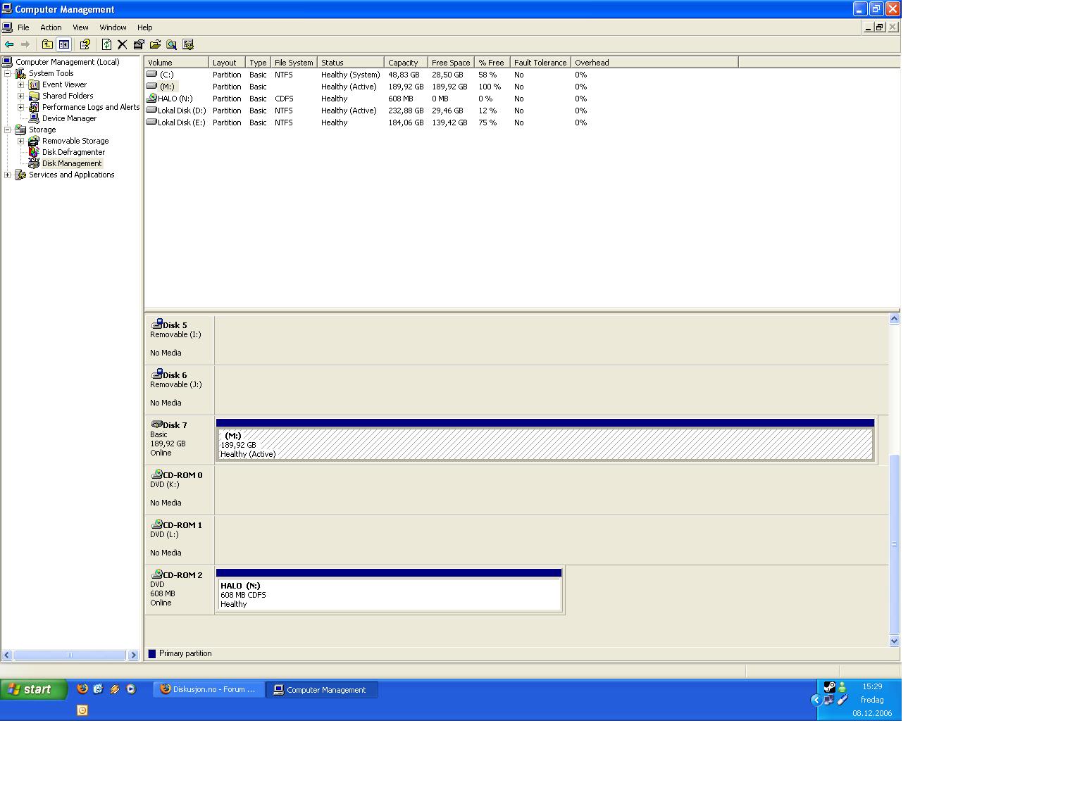 Aykon Skrevet 8. desember 2006 Forfatter Skrevet 8. desember 2006 Når eg gjekk inn på Disk manager så står det jo c: d: osv. Men på den eksterne harddisken stod det ingenting. Så da trykket eg på høgreknappen på den eksterne, og trykket på Change Drive Letther and paths. Da kom den opp som (M:) Det er det eneste eg har gjort. Laget ikke ny parstisjon. (Tenkte litt feil) Har ikke gjort noe annet enn det med den.