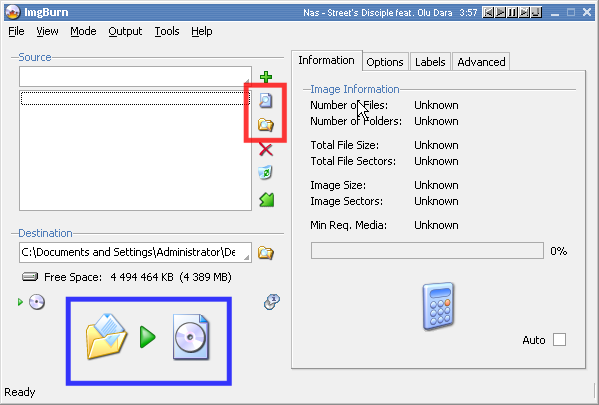 Torbjørn T. Skrevet 10. desember 2006 Skrevet 10. desember 2006 Det vil ikkje vere snakk om noko omkoding i det tilfellet. Ei ISO-fil er ei image-fil. Det er berre ein måte å pakke mange filar saman i éi fil for brenning. Vil du legge filer i ei ISO-fil, kan ImgBurn gjere dette. Vel Image File frå Output-menyen, legg til alle filene eller mappene du skal ha med knappane i den raude ramma på biletet, og trykk på den store knappen nederst (med blå ramme på biletet) for å lage ISO-fila.