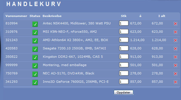 Kristian09 Skrevet 14. desember 2006 Forfatter Skrevet 14. desember 2006 (endret) Varenummer Status Beskrivelse Stk á I alt 311310 AsRock ALiveNF6G-DVI, nForce430, AM2 567,00 567,00 820130 NorthQ NQ4001BX Silent PSU Xtra 445,00 445,00 321391 AMD Athlon64 3800+, AM2, CW, BOX 834,00 834,00 750769 NEC AD-5170, DVD±RW, Black 278,00 278,00 341416 Sapphire Radeon X1600Pro, 256MB, PCI-E 766,00 766,00 420382 WD Caviar SE 1200JS, 120GB, SATAII, 8 MB 454,00 454,00 810662 shg Case EC11, Black, 300 Watt 334,00 334,00 350613 Kingston DDR2-533, 1024MB, CAS 4 872,00 872,00 999999 Montering, med emballage 501,00 501,00 Porto 15,70 Kg 125,00 NOK Tillegg 0,00 NOK Varekjøp 5.051,00 NOK I alt 5.176,00 NOK Va med denne? Er ikke den bedre en den jeg viste i stad som jeg ville at den skulle vere bedre en? Edit: Kanskje jeg kan ta vekk den strømforsyninga og bare skifte til et kabinett der 350 watt følger med. Holder ikke det? Endret 14. desember 2006 av Kristian09