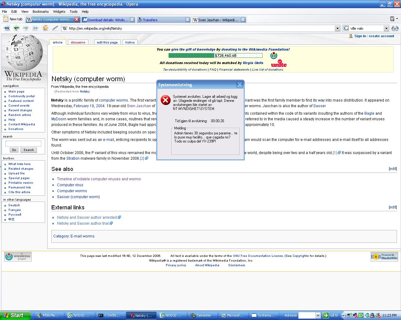Aleks_r Skrevet 29. desember 2006 Skrevet 29. desember 2006 Det hele begynte en rolig onsdagskveld, da jeg skulle åpne en .RAR-fil for å pakke ut en fix til et addon til MS FS9. Har brukt denne fixen mange, mange ganger og har hele tiden hatt den liggende på min maskin. Tenkte derfor ikke noe særlig over det, når jeg pakke ut fixen og skulle kjøre den. Da kom det bare en masse command-vinduer, og ingenting fungerte. Ingen .exe-filer fungerte i det heletatt og jeg var fortvilet som aldri før. Fikk etter mye styr og fanteri tatt en rollback til dagen før, slik at alt var tilsynelatende normalt igjen, og fungerte fint. Men - det er trøbbel i drømmeland - maskinen shuttes ned etter 30 sekunder, det dukker opp et vindu ikke ulikt det MS.Blaster fører med seg. Problemet er nemlig at det IKKE er MS.Blaster, etter å ha brukt forskjellige removal-tools, blandt annet Microsoft's egne, og Symantec sitt. Nyoppdatert Eset NOD32 finner ingen virus på maskinen, og The Cleaner finner ingenting. Trojan Cleaner og Trojan Hunter er også usuksessfulle. Det eneste som funker midlertidig, er å skrive shutdown -a i cmd. Vær så snill å hjelp meg, jeg begynner å gi opp/bli desperat.