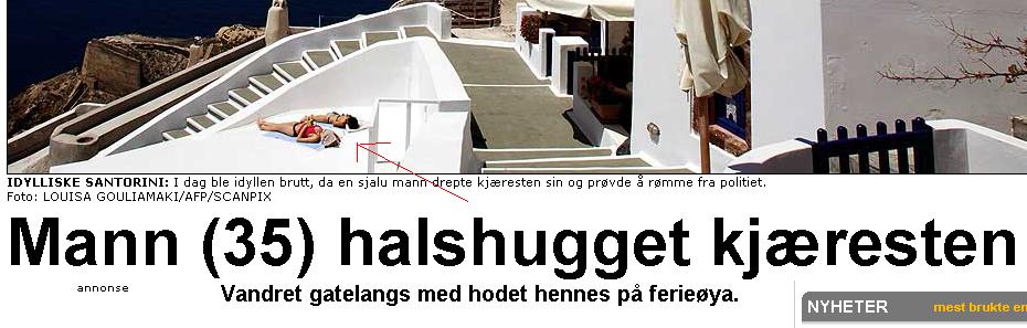 Mauro Skrevet 4. august 2008 Skrevet 4. august 2008 Se pilen. Den peker på en dame som soler seg med et håndkle eller noe lignende over hodet? Syns du det ser ut som hun er halshugget?