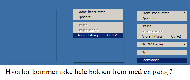 aknutsen Skrevet 6. januar 2007 Skrevet 6. januar 2007 (endret) Når jeg høyretrykke på f.eks. skrivebordsbakrunnen skal det komme opp en boks, med forskjellige oppgaver. Denne boksen er til meg blitt borte, jeg ser kun skyggen av omrisset, og må dra musa over for at den skal vises. For bilde se vedlegg. Hva er galt ? dfdf.bmp Endret 6. januar 2007 av Icecoke