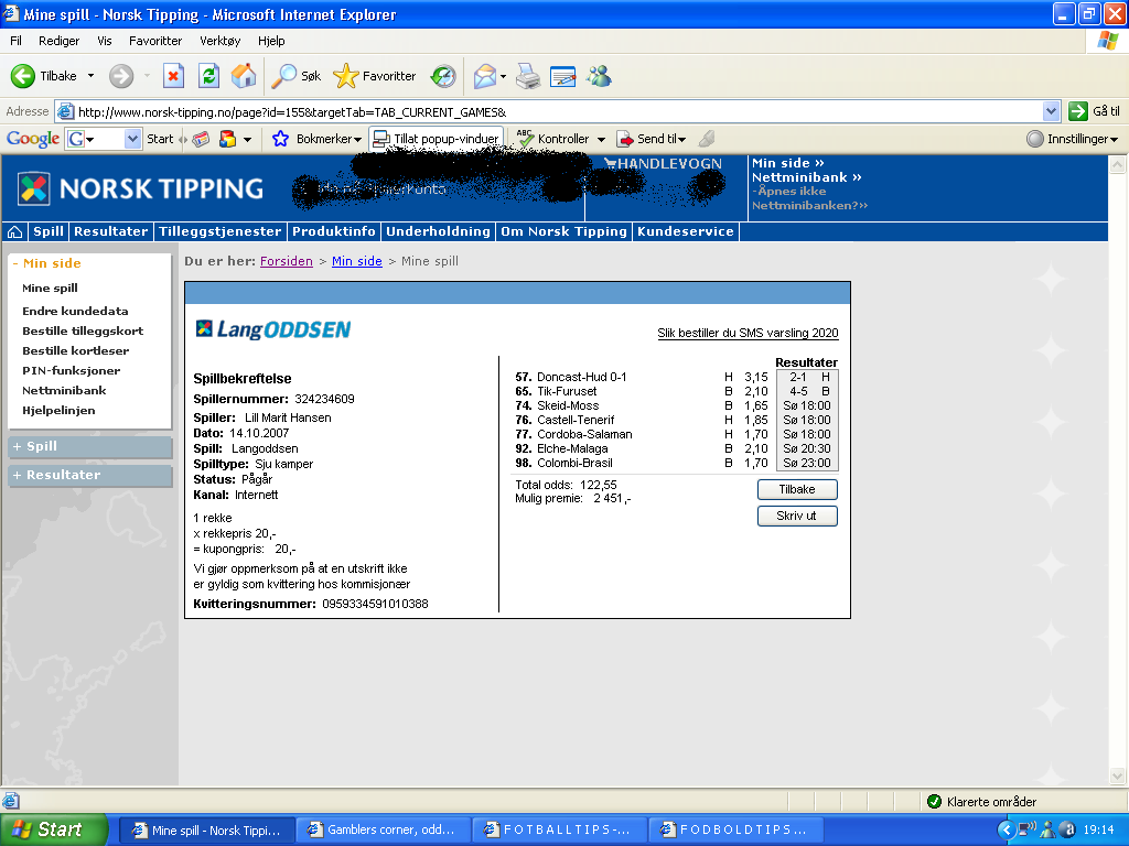 RyanReynolds Skrevet 14. oktober 2007 Skrevet 14. oktober 2007 her kan jeg jeg vinne 20 000jeg mener 2000 Får den ikke frem, men er ikke så farlig. Jeg spilte på seks kamper i går. Alle gikk inn, uheldigvis hadde jeg bare 8.69 i odds, med 40,- i innsats. Så blir litt over 300 kroner på meg, hvis vi regner med innsatsen. Ikke mye, men nå har jeg i alle fall litt å spille for neste helg.