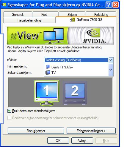 MacBain Skrevet 29. januar 2007 Skrevet 29. januar 2007 Gå inn i "Nview Desktop Manageren" til nvidia og velg så "hot keys" tabben. Deretter velger du "display mode", under denne er det ett valg om heter "switch to next display device". Legg inn en keyboard shortcut til denne og du vil kunne bytte mellom skjermene ved bare å trykke f.eks ALT+X. For at dette skal virke riktig må du kjøre "singel display" skjermmodus.
