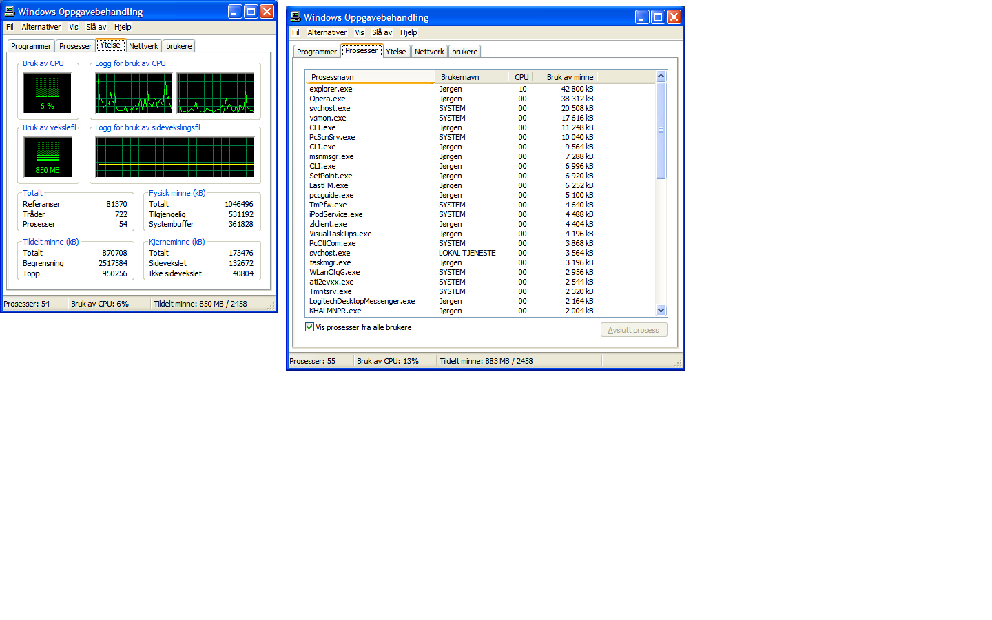 andylove Skrevet 2. februar 2007 Skrevet 2. februar 2007 Det ser ikke noe galt ut fra det bildet du har gitt oss. Annet enn at Explorer bruker vanvittig mye ram. Hos meg (kjører Vista) bruker Explorer 33MB ram. Firefox derimot kjører på 142MB ram.. har en del browser-tab oppe. Men vanligvis når maskinen bruker mye ram, mer enn normalt, så er det et program som looper, og stjeler minnet. Det har vært kjente feil i firefox og msn som har gjort dette. Har du sett hvor mye minnet du har gitt skjermkortet eller page fila? Synes det ser veldig merkelig ut. Jeg kjører som sagt Vista, og er ikke i nærheten ditt minneforbruk, selv med en del progs oppe.