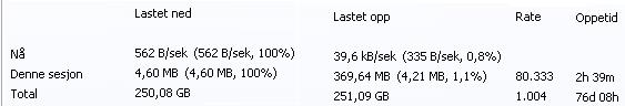Wipeout Skrevet 10. februar 2007 Skrevet 10. februar 2007 Har lastet opp 2,47 TB og lastet ned 1,45 TB sitter på en linje fra Stjelenor på 2800/440 kb/s.